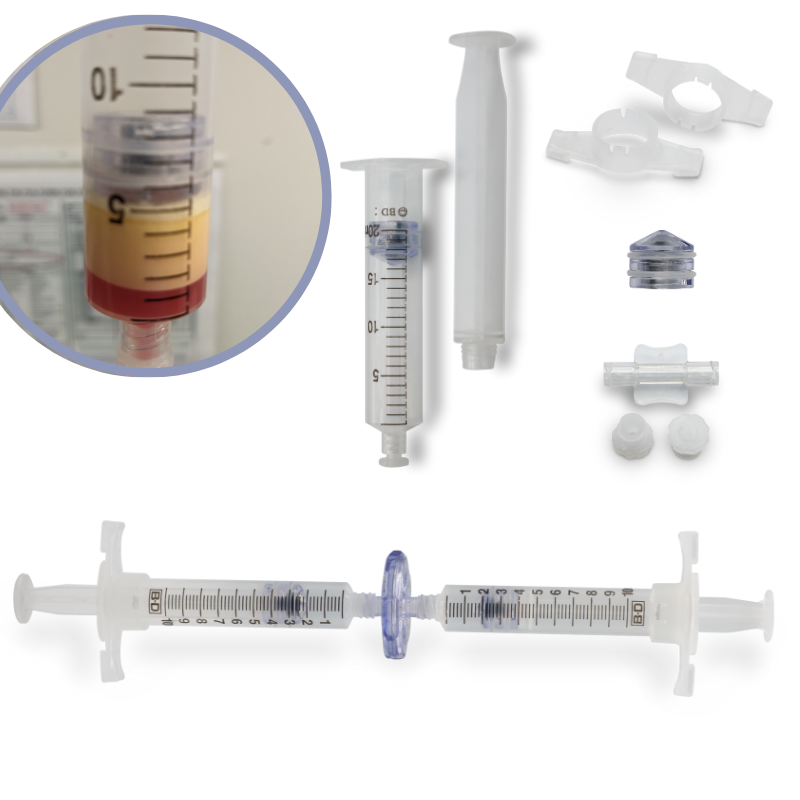 Basic syringe assembly components to convert 10cc BD brand syringes for the closed-loop, processing, and concentrating adipose tissue.