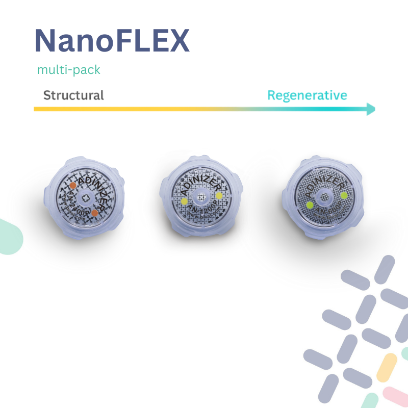 The NanoFlex Kit is designed for autologous fat treatments to both structural and regenerative fat applications. With three Adinizer® discs, this multi-pack makes it simple to prepare smooth, injectable grafts for delicate procedures, optimized for use with 18-25g cannulas and needles.